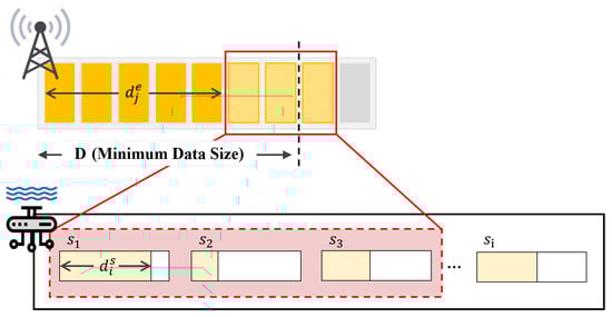 where and stand for edge servers j and smart sensors i, (set of edge servers) and (set of smart sensors), as illustrated in Figure 1, respectively. Then, is a scheduling vector for the local model training initiation in at time t, i.e., is ready to go for local model training when (otherwise, ). Note that each initiates its own local model training when it has enough training data, i.e., the number of sensing data is equal to or larger than (i.e., training initiation threshold). In addition, is a scheduling vector between and at time t. Thus, we have to obtain optimal and via the optimization solving procedure where and . Here, and stand for the existing sensing data amounts in and at time t, respectively. In (3), stands for the data size, which is required for initiating local model training in . Lastly, stands for the number of antennas in .