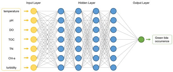 The green tide occurrence prediction model used in this paper is a binary classification model based on deep neural networks. Based on the seven water quality indicators data observed in real-time, the model learns the relationship between the indicator values and the possibility of green tide occurrence.