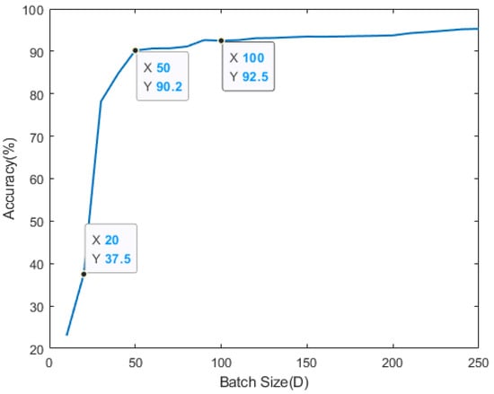 First, we derive the local model performance for each edge of the river, increasing the size of D from to . As the value of D becomes larger, the accuracy of the local model, which is trained on one edge is increased. As we can see in Figure 6, the local model’s accuracy rises sharply at the moment where D size is between 20 and 50. When D size is over 50, the accuracy is slightly higher and is converging to or more from D is 100. Because the frequency and number of smart sensors generating water quality observation data in the Keum river are fixed, the total amount of data that exists within the entire system is also defined. Therefore, it is necessary to set the appropriate value of D in advance. Based on the result in Figure 6, the simulation is set to target where the local model of each edge guarantees more than accuracy.