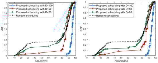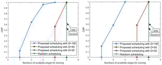 Consequently, the results of the proposed scheduling algorithm show that the case of satisfies the appropriate balance between the number of local learning available edges and accuracy. In Table 4, when D has value of 50, the largest number of edges during all iterations satisfy target performance. When D has a small value such as 20, the proposed scheduling with has a similar ratio to the random scheduling in Table 4. Even if almost all edges are allowed to start training, the performance of edges being more than is not always guaranteed. The experiments also present that, if D is too large, high performance models can always be obtained. However, in this case, each edge should receive more than the threshold value D and it is impossible to get many edges that can perform learning.