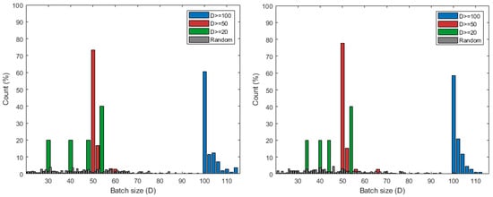 We also measure the number of edges that satisfies the training threshold D and the actual data size of the edges over the 50 iteration. Table 3 shows the number of accumulated edges that satisfies the conditions according to the value of D, as tested using 5 edges located in Backjae barrage and Gongju barrage. The random matching, which is represented with gray color, results in all edges being able to start local learning with the received data no matter the size. It also has the most variety in the numbers of data distribution. If , 5 edges always meet the threshold during all iterations. If , most edges satisfy the D value according to Figure 7, and eventually approximately 220 edges always have more than D data. Even if , as seen in Figure 7, only two or three edges meet D on average, and less than of the edges of have 100 or more data. Figure 8 shows the amount of data the edges have based on the cumulative number of edges that meet the D condition. For , edges obtained between 30 and 55 pieces of data, and always exceeds the threshold value of 20. For , or more of the cumulative number of edges receive data as much as the value of D, and in some cases have more than D. If , all of the data on the edge in Figure 8 that are distributed have at least 100 pieces of data applied to approximately 110 cumulative edges as seen in Table 3. About 140 edges, excluding 110 out of 250 total, always receive less than 100 pieces of data and fail to perform the learning.