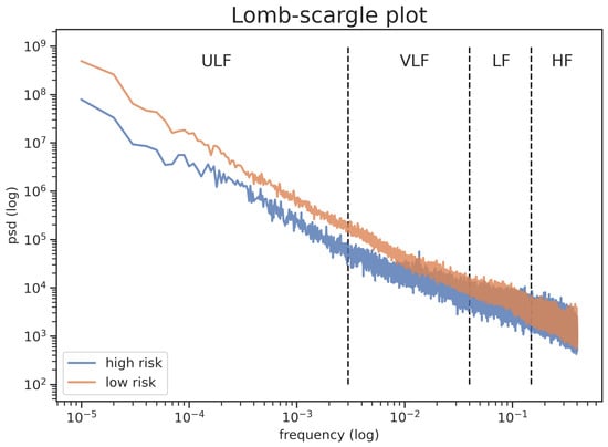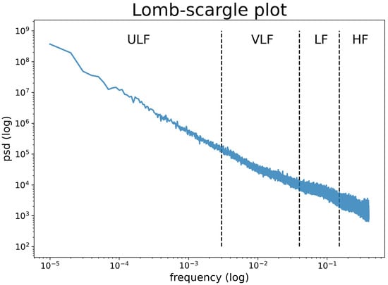 The power spectrum of a time series describes the distribution of power into frequency components () composing that signal. Due to the fact that the inter-beats intervals are not uniformly distributed (unevenly sampled time-series) the Power Spectrum Density (PSD) are computed using the Lomb–Scargle Periodogram [31,32] instead of the Fourier Transformation that requires uniformly sampled data. The PSD can be used to compute the variance (net power) of a process by integrating over frequencies as showed in Equation (5).