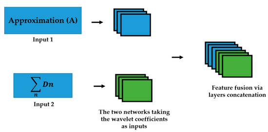 We propose to use the different wavelet coefficients from the 2D-DWT decomposition as the inputs of different networks in parallel. This idea was fully discussed and its effectiveness demonstrated in [50]. We upgraded the idea by alleviating the learning (training) process by reducing the total number of needed networks and, consequently, the total number of the parameters to handle. The 2D-DWT in the first level produces 4 different matrices of coefficients. The approximation coefficients, which represent the low-frequency information of the inputs, and the three different details coefficients, which represent the high frequency components of the input signal. The three details coefficients are the horizontal, vertical and diagonal details. Unlike in [50], where four different networks were utilized in parallel for all the four coefficients, we sum up all the details coefficients in order to incorporate all the high frequency components in one single channel. Thus, as illustrated in Figure 2, two networks are trained in parallel: the first network takes the approximation coefficients as the inputs, and the second network takes the sum of all the three details coefficients as inputs.
