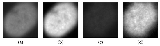 In Figure 4a, we show a positive intensity homogeneous cell. Images shown in Figure 4b–d represent its different details coefficients, the horizontal, vertical and diagonal details, respectively. The image shown in Figure 4e is the result of summing all the details. We can remark that the sum incorporates all the information from the three details coefficients. Similarly, in Figure 4f, we show a negative intensity homogeneous cell image. In Figure 4g–i, we show the three details coefficients and Figure 4j represents their sum. Note how the two sums (Figure 4e,j) highlight the homogeneous cell’s shape, boundaries and internal gray variations. Since these three elements differ from a cellular type to another, we can expect two main contributions from the sum of details. First, they will bring a certain heterogeneity between the classes by forcing all the negative intensity images to exhibit typical characteristics of their cellular type (shape, boundaries and gray variations). This will contribute to the reduction of the interclass similarities.