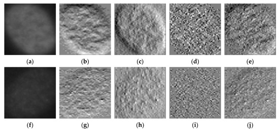 HEp-2 cellular images from the SNPHEp-2 dataset. (a) A positive intensity homogeneous cell and (b–e) its horizontal, vertical, diagonal details and their sum, respectively. (f) A negative intensity homogeneous cell and (g–j) its horizontal, vertical, diagonal details and their sum, respectively. The original images in (a,f) have a size of 112 × 112. Their respective detail coefficients in (b–e) and (g–j) are all downsized by half (56 × 56). All the images in the figure were identically resized for the purpose of visualization.