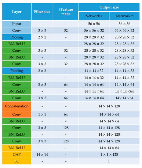 Two main observations need to be made about the architecture in Figure 5. First, all the convolutional layers preserve the spatial dimensions of the input volume and only the pooling layers perform the spatial downsampling. Second, the feature fusion is performed by the 1 × 1 convolutional operation that directly follows the concatenation. After concatenating the layers from the two networks, we obtained a volume of size 14 × 14 × 128, which is then passed through the 1 × 1 convolutional layer whose purpose is precisely to mix (fusion) the information from the two networks. The output volume of the final residual block has the dimensions of 14 × 14 × 128. This volume is given to the global average pooling (GAP) layer in order to obtain the final one-dimensional feature vector of size 1 × 1 × 128.