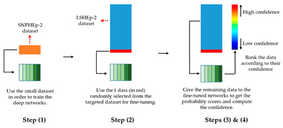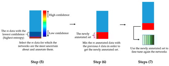 The least confidence and margin sampling methods work similarly and, unlike the entropy, are both less suitable for the multiclass classification. In fact, in Equation (5), only two classes are taken into account, while the entropy utilizes all the classes’ probabilities. In our case, we will adopt the entropy in order to evaluate the uncertainty of the deep parallel residual networks. Other uncertainty sampling methods can be found in [57,58,59]. For clarity, we summarize the different steps of the proposed active learning scheme in Table 1. Figure 7 illustrates these different steps.