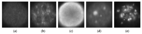 The deep residual networks were first trained using a relatively small dataset, as mentioned before. We adopted the SNPHEp-2 dataset here for this initial learning process. This dataset was presented by Wiliem et al. [5] and comprises five classes, which explains why the classification layer of the networks shown in Figure 5 had five neurons. The five classes (cell types) are the homogeneous, the coarse speckled, the fine speckled, the nucleolar and the centromere cells. The dataset contains 1884 data, divided into two sets: 905 images for training and 979 others for testing. Figure 8a–e shows one sample per class from this dataset.