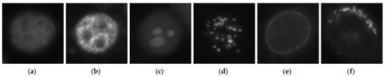 - Cataldo, S.D.; Bottino, A.; Ficarra, E.; Macii, E. Applying textural features to the classification of HEp-2 cell patterns in IIF images. In Proceedings of the 21st International Conference on Pattern Recognition (ICPR2012), Tsukuba, Japan, 11–15 November 2012; pp. 689–694. [Google Scholar]