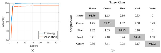 Results of the initial learning process: (a) the progression of the accuracy of training and validation; (b) the confusion matrix (total accuracy of 94.31%). “Homo”, “Coarse”, “Fine”, Nucl” and “Centro” stand for homogeneous, coarse speckled, fine speckled, nucleolar and centromere, respectively.