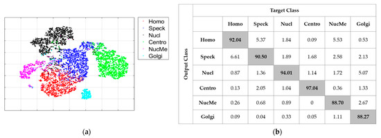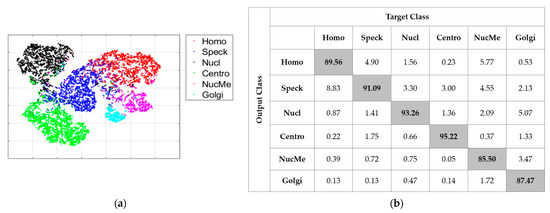 The second case, denoted as “IN-AL”, consists of selecting the 20% with active learning in order to perform fine-tuning. In Figure 14a,b, we have, respectively, the visualization of the features and the confusion matrix. As for the “AL” case discussed previously, we can notice how active learning permitted to tackle the extreme confusion between the Golgi and the nuclear membrane cells. This can be noticed in Figure 14a with the two clusters being completely disjoint, and in Figure 14b, where we see that the two cells accomplish reasonable accuracy. For this case, the MCA was 91.76% and the ACA was 92.77%. The most important observation here was that active learning strongly minimized the divergence between the two metrics by assuring a quite fair discrimination for all of the cellular types. Note that all of these results were obtained by using only 20% of the available training instances in the large HEp-2 dataset.