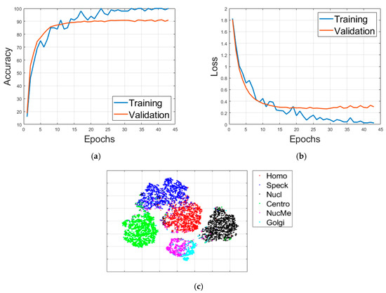 As said before, all of the following results concern the case of 20% of the limitation. Figure 11 shows the detailed results of the “RS” case. This case just consists of selecting randomly 20% of the images and uses them to train the deep networks. Figure 11a shows the accuracy evolution over the training and validation sets (21 epochs). Figure 11b shows the loss evolution for the two sets. Figure 11c shows the visualization of the high-level features learned by the deep networks. All the visualizations here are obtained using the t-distributed stochastic neighbor embedding (t-SNE). Finally, Figure 11d shows the confusion matrix of the classification over the validation set. In all the confusion matrices shown here, “Homo”, “Speck”, “Nucl”, “Centro”, “NucMe” and “Golgi” refer to the homogeneous, speckled, nucleolar, centromere, nuclear membrane and Golgi cells, respectively.