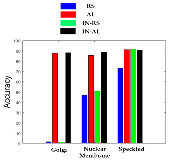 In Figure 15, we show the classification accuracies of the three most difficult cells for the four cases (“RS”, “AL”, “IN-RS” and “IN-AL”). We can notice how both cases that use active learning, by allowing one to prioritize the annotation of the most difficult cells, “correct” the classification accuracies of the cases without active learning (especially for the Golgi and nuclear membrane).