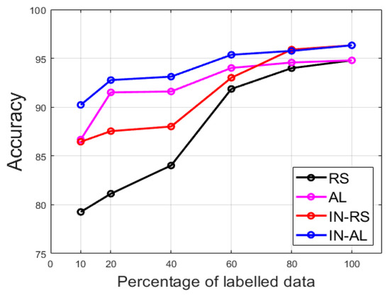 In Figure 16, we show the summary of the results (ACA) for the others limitations. We show for the 10%, 20% (discussed in details previously), 40%, 60%, 80% and 100%. As explained before, the 100% case refers to the fact of using all the available training data. There was no active learning process in this case since all the data were supposed to be labeled. In this case, and only for this case, random sampling and active learning results were the same, as we can notice in Figure 16. For all the other limitations, we can see how active learning can help to achieve satisfying results even though we do not have access to the totality of the training data. In fact, for all the limitations, active learning-based labeling provided accuracies that were superior to 90%. It is only for the case of 10% limitation that active learning without cross-modal transfer learning (“AL”) achieved 86.68% (see Figure 16). However, this result could be significantly improved by using cross-modal transfer learning, as proposed in this work. In that case (“IN-AL”), the accuracy for the 10% limitation reached 90.23%. In other words, active learning coupled with cross-modal transfer learning allows one to achieve satisfying discrimination results even with a few number of labeled data in hands.