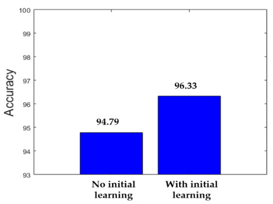 Accuracy improvement with the initial learning in the case of 100% of the training data available.