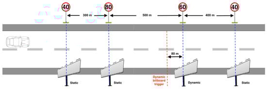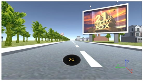 There were a total number of 50 test regions each containing a speed sign and digital billboard. The speed signs were located on the left side of the road and the billboard on the right. Each speed sign and digital billboard pair was positioned on the same x-axis as shown in Figure 2 and Figure 3. The distance from the current pair of speed sign and digital billboard to the next pair was defined according to the speed limit displays on the speed sign (see Figure 2). For instance, if the current speed sign is limited at 40 km/h, then the distance from the current pair of speed sign and digital billboard to the next pair is at 300 m. For the speed limit at 60 km/h, the distance was set at 400 m. For the speed limit at 80 km/h, the distance was set at 500 m. There is no particular reason to choose these values, but 300-unit distance is guaranteed the next digital billboard is not recognisable when the driver is located at the current digital billboard. Another consideration was the length of the driving time should not be too long, to avoid driver fatigue. The speed limit values were set randomly but chosen to avoid signs having the same speed consecutively (see Table 1).