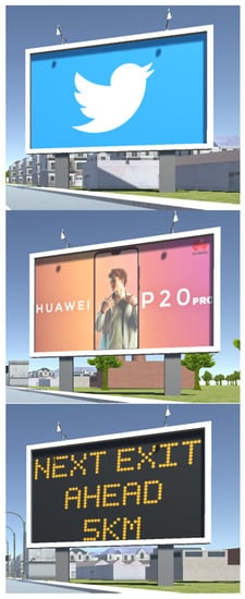 The content of digital billboards was randomly chosen from well-known lists of brand logos, simple advertisements, or traffic messages. Figure 4 shows three examples of digital billboards that are used in this experiment. The 50 digital billboards have been divided into two categories. Half of the billboards are static billboards, which only display an unchanging image on the billboard throughout the experiment, the other half are dynamic billboards, which allow the displayed image that change once as the driver approaches. The dynamic billboards change their content at a distance of about 80 m from the billboard measured in the x-direction. This estimated threshold was defined as the distance between the point where the speed sign becomes readable to the driver and the billboard. This was done by running the simulator at a fixed speed and noting the point at which the sign was readable using a keypress.