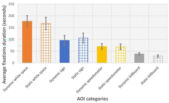 The age, the driving experience, the number of dynamic billboards on which there is a fixation, and the total fixation during each AOI is shown in Table 3. The average fixation durations in each AOI between dynamic segments and static segments is shown in Figure 6.