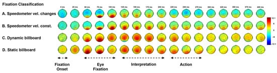 Each epoch is baseline corrected from −200 to 0 ms. An automatic epoch rejection is used to remove epochs, in which any voltage potential exceeded ±75 µV threshold. The number of remaining trials is used to generate a grand average analysis for each condition: condition (A), 345 trials; condition (B), 426 trials; condition (C), 89 trials; condition (D), 120 trials. Artefact-free epochs are grand averaged to reduce the random brain activity seen in the underlining ERP components following the four conditions. These include the components shown in Table 2. Differentiating the categories between billboard fixations and speedometer fixations is measured by the potential of the ERP components [].