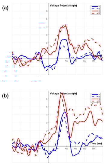 Grand average ERP of channel ERP plots. Plot (a). Grand average ERP of channel P7. Plot (b). Grand average ERP of channel P8. Signal A, B, C, D is consistent with Figure 7.