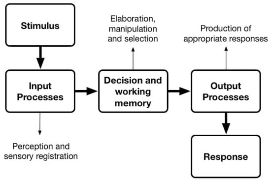 Furthermore, we can show the series of ERP components agrees with several proposed human information processing models, for example, Figure 10. The input processes stage refers to the acquisition and registration of multiple sources of information []. The visual P1, N1 components represent the registration of stimulus input. The following stage, decision, and working memory, involves conscious perception and manipulation of processed and retrieved information in working memory, in addition, this stage also includes cognitive operations, but these operations occur prior to the point of decision, then decisions are made based on such cognitive processing []. The P2 component represents the early cognitive process to the input stimulus. The output processes stage involves the implementation of a response or action consistent with the chosen decision []. The N2 component reveals the production of appropriate responses. The analysis has demonstrated that the combination of ERP and eye tracking, when used in a driving simulator, can be utilised to follow the cognitive response related to driving stimuli as they are processed by the brain.