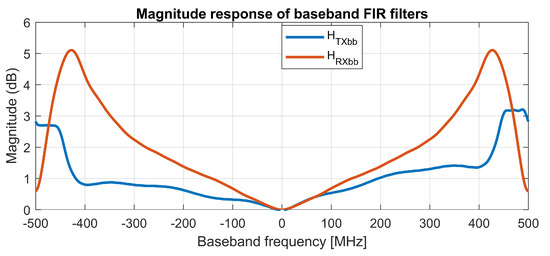 In the described test-bed, the compensation of frequency-dependent gain and phase imbalances is done in three steps. First, the frequency dependent amplitude variations are corrected by an FIR filter with the complex coefficients allowing for non-symmetrical frequency characteristic, with the measured magnitude response shown in Figure 5. For the second step, the frequency-independent imbalances of the quadrature I/Q modulator are corrected with the values obtained by the measurements summarized in Table 4. In the third step, a first-order frequency-dependent phase imbalance is corrected by a fractional delay introduced into the quadrature path of TX. The fractional delays were calculated from slopes of linear approximations of the quadrature error. The measured phase imbalances (sometimes denoted as quadrature errors) before and after compensation are shown in Figure 6 for both the transmitter and the receiver.