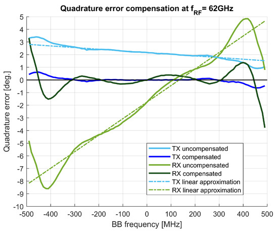Quadrature error at TX and RX sides, with and without digital compensation.