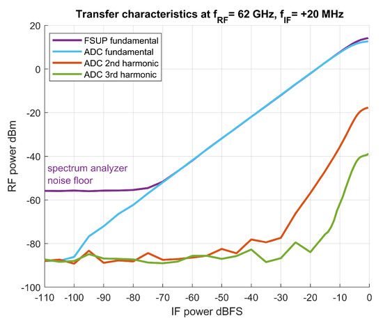 An example of the transfer characteristics of the whole transmitter–observation receiver chain at an RF frequency of 62 GHz is shown in Figure 7. The output power was also measured by an FSUP spectrum analyzer (a violet trace) and the observation receiver path gain was calculated and applied accordingly. At maximum power, the FSUP trace indicates that the transmitter is driven to approximately 2 dB compression. Additionally, ADC power and FSUP power traces are separated, indicating that the receiver is driven to compression (about 1.5 dB below the FSUP trace).