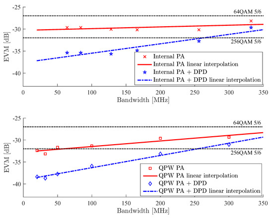 The EVM results as a function of signal bandwidth for the two cases of power amplifiers operated at an RF frequency of 62 GHz and driven with an OFDM waveform are shown in Figure 8. For better orientation in the graphs, the discrete measured points denoted with markers have been linearly interpolated by dash-dotted (with DPD) and solid (without DPD) lines.