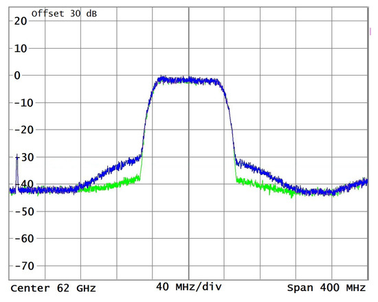 Besides the reduction of in-band distortions that we have demonstrated on EVM curves, the out-of-band emissions caused by the nonlinearity were reduced by DPD. Although the out-of-band emissions are not as important in the 60 GHz band due to the spatial separation of users in mm-waves, we investigated the effect of predistortion to a transmitted spectrum. An example of a spectrum measured at the QPW PA output with and without predistortion is shown in Figure 9 for a 16 QAM signal with a 100 MHz bandwidth. Note that due to the limited sensitivity of the spectrum analyzer with an external harmonic mixer, we are not able to present the spectrum results for wider bandwidths.