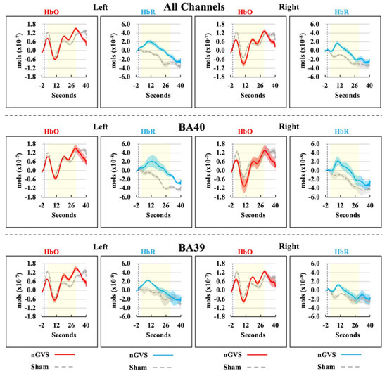 Figure 3 shows the hemodynamic response functions for HbO and HbR in the nGVS and sham conditions. From visual inspection, mean values for HbO during the nGVS and sham conditions tended to remain above zero, with the response slightly higher in the nGVS condition, particularly in relation to the left hemisphere. For HbR, mean values were elevated in the nGVS condition compared to those in the sham condition for the whole duration of the noisy stimulation. This is evident in all channels as well as BA40 and BA39 analyses.