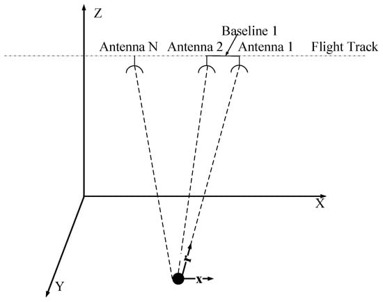 where is the complex target reflectivity image of pixel i and represents the steering vector of the target signal. is the phase shift between the first channel and nth channel. As the maximum size of the observed scene is small compared with the antenna distance to the target, the phase shift can be expressed as follows []: