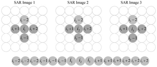 By considering the defocusing characteristics of moving targets and the correlation of adjacent pixels in the SAR image, we use the current pixel and its adjacent pixels to construct the joint data vector for GLRT detection. Without losing generality, we chose radar with three channels and four adjacent pixels like “+” windows for modelling. When images are severely defocused, we should expand the windows; however, this will increase the calculation burden. However, how to choose the appropriate windows is outside the scope of this article. The formulation of the joint data vector is shown in Figure 2.