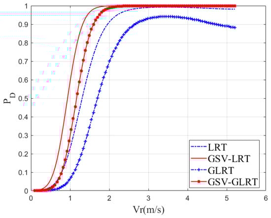 Next, Figure 5 shows the detection probability of different radial velocities under a constant false alarm probability. The was chosenas under . The curves were drafted by using repetitions. The CNR was 13 dB and the SCR was −5 dB. We choose the larger velocity range that can be estimated and detected unambiguously to test. When the detection probability was 0.9, theoretically, GSV-LRT can detect a slow-moving target with a velocity of 1.2 m/s, while that of the traditional LRT was 2 m/s. Although the suboptimal GSV-GLRT detection performance declined, it can still be 1.5 m/s, while the traditional GLRT was 2.6 m/s. Therefore, GSV-GLRT is closer to its theoretical optimal performance and has a lower detectable velocity. The reason why GSV-GLRT can reduce the minimum detectable velocity of the system is that it effectively accumulates the moving-target signal. Thus, the GSV-GLRT has the lower minimum detectable velocity of the two.