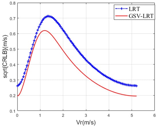 Lastly, in order to better investigate the estimation accuracy, we report the curves for the radial velocity in Figure 6 []. The CNR is 10 dB and the SCR is -5 dB. Because GSV-GLRT and GLRT do not have a closed expression, CRB cannot be calculated. Comparing GSV-LRT curve with LRT curve, it can be found that the GSV-LRT has better accuracy of radial velocity estimation. In fact, GSV-LRT effectively improves the SCR, which leads to a decrease in CRBL []. Accordingly, we can regard that the GSV-GLRT has better accuracy than the GLRT.