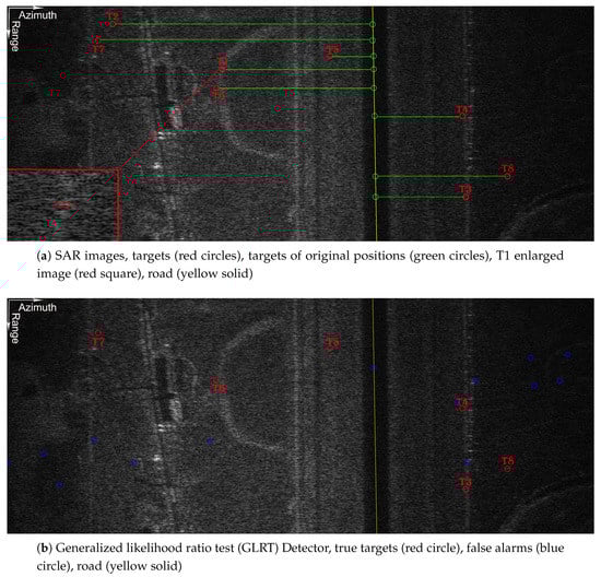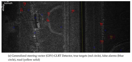 In Figure 7a, we can observe that T1 is defocusing though it is submerged by the clutter. The defocus of T8 with high SCR is easier to observe. When the false alarm probability was , the detection results of the GSV-GLRT are shown in Figure 7c and the detection results of the GLRT are shown in Figure 7b (the points detected near the actual moving target are not regarded as a false alarm point). The detection results show that all the eight moving targets were detected by the GSV-GLRT, while six targets were detected by the GLRT except T1 and T2. The proposed detector improves the detection probability as it reduces the false alarm points. The results of estimated parameters are shown in Table 2. It can be seen from Table 2 that SCR and greatly affect the performance of the two detectors, and the detection performance of the moving target with faster radial velocity is better. Slower radial velocities cause smaller phase offsets among channels, and the decreased SCRs caused by defocusing make the detection more difficult. According to the parameter estimation in Table 2, the errors of the GSV-GLRT detector were less than 0.23 m/s, while the errors of the GLRT detector were 1.05 m/s. It can even estimate the parameter of a very slow-moving target within an error of 0.09 m/s.
