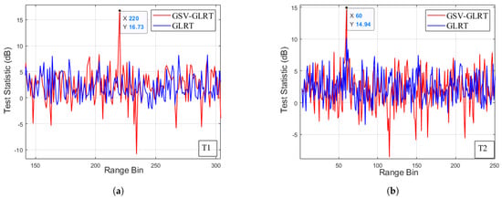 Detection results of the detectors (a) test statistic of target T1 in R = 220 (b) test statistic of target T2 in R = 60.