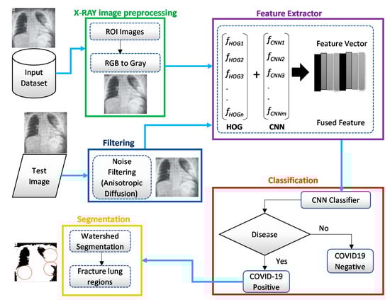 A modified anisotropic diffusion filtering technique was employed to remove multiplicative speckle noise from the test images. The application of these techniques could effectively overcome the limitations in input image quality. Next, the feature extraction was carried out on the test images. Finally, the CNN classifier performed a classification of X-ray images to identify whether it was COVID-19 or not. Figure 2 shows the basic steps of the proposed system architecture, which is also represented by Algorithm 1.