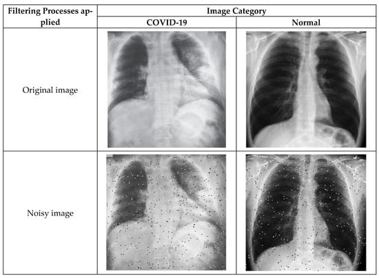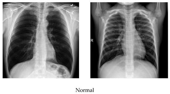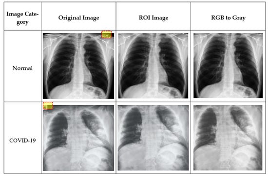 To eliminate superfluous text and machine annotations around images, the region of interest (ROI) was extracted for training and testing. In order to obtain meaningful information, the ROI on the chest X-ray images was defined by an area covering mainly the lung region. First, an ROI is defined by a rectangle, and a mask is created from the rectangle. Using logical indexing, the area outside the ROI was set to zero, and the extracted portion is displayed. Figure 4 illustrates example images at different preprocessing stages. For example, unnecessary symbols (tick mark in normal image) or text (B in the COVID-19 image) in the original images were removed at the ROI stage. As the images used in this study were collected from three different sources, they might differ in quality, size, or inherent noise. Therefore, the preprocessing approaches employed would normalize all the images such that they were independent of their origin, and the image size effect on the system’s performance could be avoided [39].