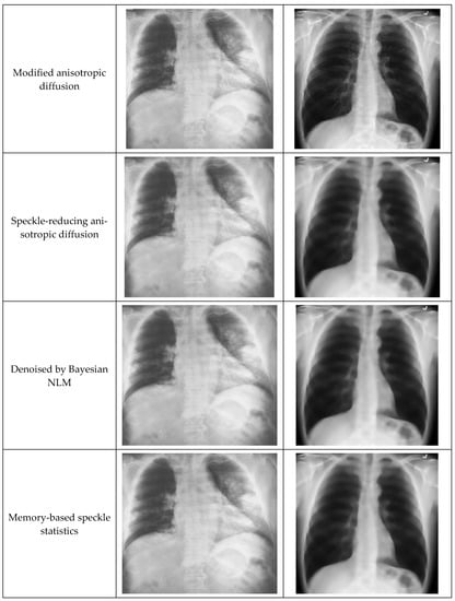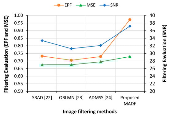 Filtering techniques preserve useful information while filtering any noise within an image. To extract the meaningful features of any noisy image, the information-preserving filtering techniques are most applicable [21]. During the testing phase, speckle-affected test images were used to assess filtering performance. Anisotropic diffusion filtering can preserve and enhance edge information while subduing any noise [24,47]. The gradient operator detects the edge information along with noise [48]. This technique finds the gradient changes in noise for strong speckle and low contrast images, which may go beyond the gradient of edge. These changes destruct the edge information than the noise, which provides less accuracy in filtering results. Similarly, speckle reducing anisotropic diffusion (SRAD) cannot fully preserve the edge information due to image over-smoothing [49]. Oriented-based non-local means (OBNLM) fails to hold detailed information and is affected by moving noise [27]. Anisotropic diffusion with memory-based speckle statistic (ADMSS) is sharper in white pixels [50].