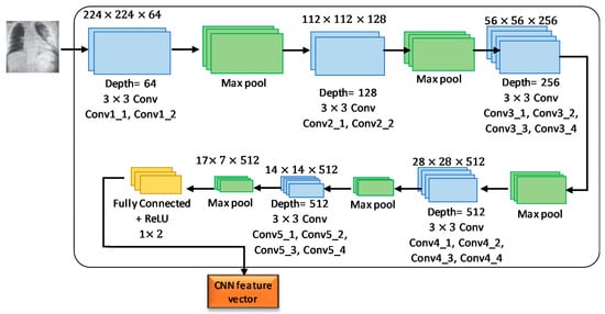 The VGG19 architecture consisted of 16 layers of CNN, 3 connected layers with 1 final output layer for conducting SoftMax function. No changes in the number of connected layers and final layer are required to build the network architectures. In addition, 2 × 2-pixel windows with stride 2 were used for the max-pooling layer. The first two layers and third layer of the three fully connected layers provided 4096 features and 1000 channels, respectively. The final layer represents the output layer with two neurons (COVID-19 and normal).