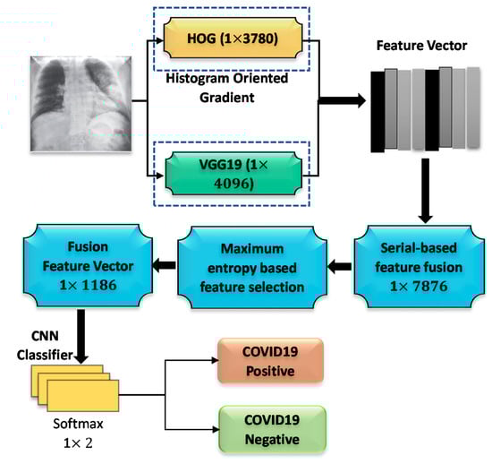 Where f is fused vector (1 × 1186), p denotes features probability, and He represents entropy. This entropy-based feature selection method selects similar or highly related features from the fused vector. Unrelated features were removed, and appropriate features were considered for classification. In this proposed system, the appropriate feature vector is 1 × 1186. CNN classifier uses the selected features where the process of feature extraction and selection is shown in Figure 8. Furthermore, the feature vectors obtained by HOG and deep learning were fused to validate the proposed approach in this work.
