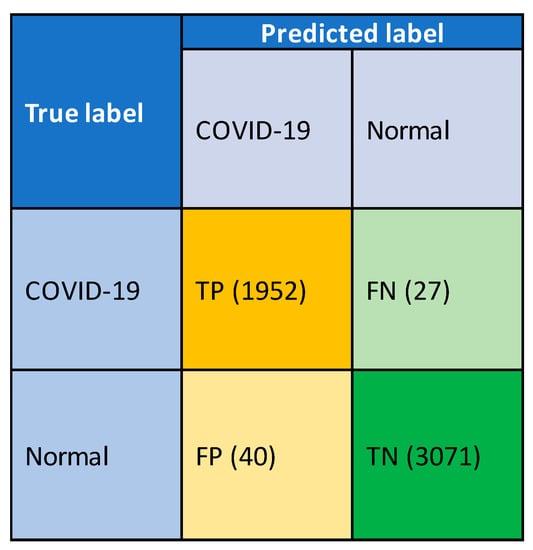 Figure 10 presents the confusion matrix derived from the measured performance parameters for the overall system during the classification stage. During the course of the evaluation, the proposed method required labeled test data to validate its predicted output. The confusion matrix represents an overall system performance. The system cannot detect 27 COVID-19 positivity images and correctly detects 1952 COVID-19 positivity images out of 1979 images. The system cannot correctly detect 40 normal images and correctly detects 3071 normal images out of 3111 images.