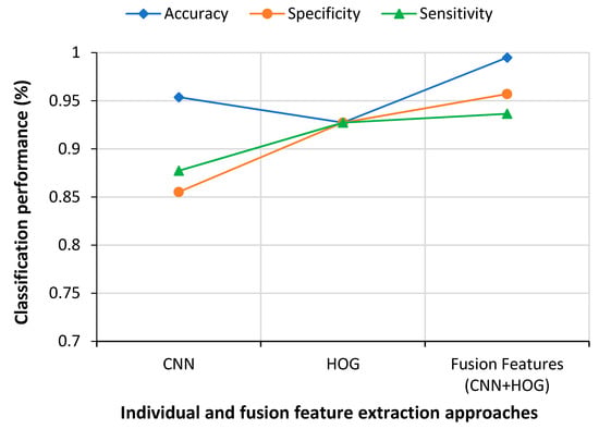 The proposed method employing feature fusion extracted by HOG and CNN (VGG19) showed better accuracy using CNN classifier. CNN provides a good result as a binary classifier for the chest X-ray dataset. However, when the classification was carried out with features extracted either by CNN or HOG individually, the accuracies were much lower compared to the reported values. HOG was the worst among the three, with an accuracy of 92.73%. Similarly, only SVM (97.16%) showed accuracy higher than 95% compared to the other two classification techniques, such as ANN (89.21%) and KNN (90.67%).