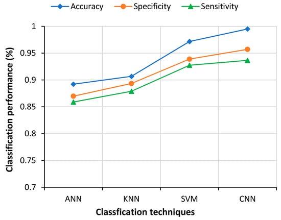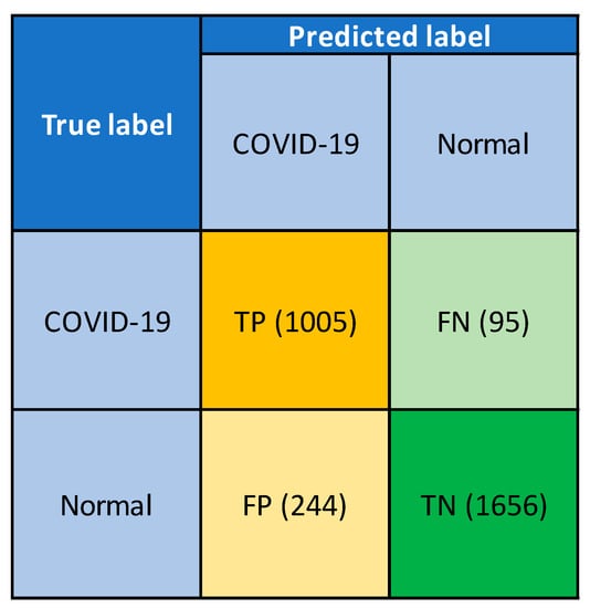 Three metrics, namely accuracy, specificity and sensitivity, were employed to measure the performance of the system developed for automatic COVID-19 detection from the chest X-ray images. Four different performance parameters, namely true-positive (TP), true-negative (TN), false-positive (FP) and false-negative (FN), were used to compute the metrics as defined by Equations (20)–(22).