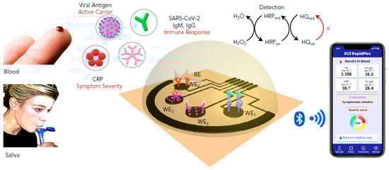 Electrochemical immunosensing is based on the conversion of the antibody–antigen interaction into electrochemical signals. In contrast to traditional immunoassays, innovative transducers allow a highly sensitive quantification of the targeted antigen/antibody in different ways [15]. It should be noted that sensitivity plays a crucial role in viruses detection; lowering the detection limit allows the early diagnosis of the infection before the first symptoms [16]. In addition to their sensitivity and robustness, electrochemical devices can be miniaturized, providing an immediate response without referring to specialized labs and qualified staff [17]. For instance, Fabiani et al. employed carbon-black-based screen-printed electrodes as transducers and magnetic beads as an immobilization support for the immunological chain comprising anti-IgG (Immunoglobulin G) bound to the anti-S and anti-N antibodies. The principle is based on the specific recognition of the anti-S and/or anti-N antibodies with the virus present in the sample. After the antibody–antigen interaction, polyclonal anti-S and anti-N antibodies are added, followed by an alkaline-phosphatase-labeled secondary antibody. Finally, the conversion of the enzymatic substrate to the electro-active by-product 1-naphtol was monitored by differentialpulse voltammetry (DPV) using a portable potensiostat connected to a computer. The immunosensor analytical performances were confirmed in standard solutions of S and N proteins and untreated saliva. Moreover, experiments using cultured virus at biosafety level 3 and in saliva clinical samples were carried out by comparing the data using the nasopharyngeal swab specimens tested with RT-PCR. Despite its high sensitivity for SARS-CoV-2 and selectivity toward H1N1 influenza virus, the reported immunosensor requires several steps of construction and antibodies, thusincreasing the complexity and cost of the method [18]. Later, a simple and low-cost electrochemical immunosensing strategy was reported for the simultaneous measurement of the nucleocapsid protein, IgG and IgM (Immunoglobulin M) specific to the S1 protein, as well as C-reactive protein (CRP) levels. These biomarkers provide information about the infection, immune response, and disease severity. The telemedicine Rapidplex platform is composed of four graphene electrodes fabricated by laser engraving [19]. Electrodes are designed based on the sandwich/double sandwich for Igsand indirect immunosensing for N and CRP (Figure 1). The effectiveness of each electrode was monitored amperometrically in blood and saliva samples. Excellent results were obtained in terms of sensitivity, selectivity toward SARS-CoV-1 and MERS-CoV, as well as reproducibility and stability [20]. In brief, this innovative platform should meet the high requirement for modern diagnosis tools allowing accurate, simple and rapid monitoring of SARS-CoV2 infection. In a recent study, Zourob’s group developed cotton tipped electrochemical immunosensor for the nucleocapsid protein detection. The novelty of the described strategy is in combing the sample collection and detection tools in a single platform by coating screen-printed electrodes with absorbing cotton padding. The detection principle was based on the competition between the immobilized antigen on screen printed electrodes and that present in nasal samples, to bind N protein antibody in solution. This platform would avoid sample pre-treatment and transfer which are indispensable in the other diagnosis approaches [21].