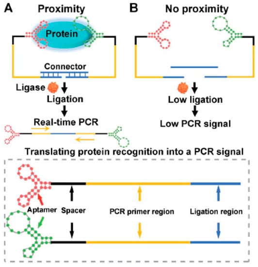 Schematic representation of the aptamer-assisted proximity ligation assay for COVID-19 antigens. The aptamer- proximity ligation assay has two important components: two proximity ligation probes: an aptamer region for target recognition and a spacer region to minimize the structural steric hindrance(obstruction). (A)The binding of the two aptamers to the same protein target could bring the ligation region into close proximity. Then, the two ligated aptamers hybridize with the connector template, to form a DNA (Desoxyribonucleic acid) complex used for subsequent ligation-dependent qPCR (quantitative PCR) amplification. (B)The absence of the target hampers the proximity of the two probes leading to a low ligation event and weak nonspecific qPCR signals. Reprinted with permission from [68].