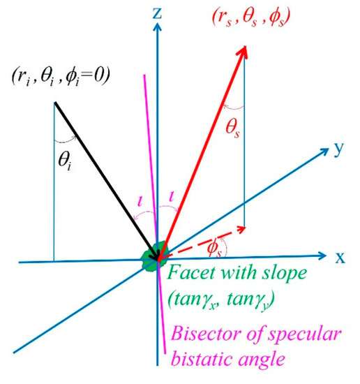 where θil is the local incidence angle satisfying the specular reflection condition (i.e., θil = θsl on the tilting surface, θsl is the local scattering angle), γ is the global tilting angle, tanγ = (tanγx, tanγy) = (ζx, ζy) is the corresponding surface slope, and p(tanγx, tanγy) = p(ζx, ζy) is the probability density function (pdf) of the background (global) surfaces that tilt the specular patches. The term inside the double integrals and before the pdf function, that is essentially Equation (8), is now interpreted as the scattering pattern, and Equation (12) is equivalent to the tilting modulation of local incidence angle in the discussion of scatterometer returns [8] with the pdf function accounting for the off-specular contribution. For the Gaussian distribution of sea surface slopes with equal up-downwind and crosswind slope components, i.e., ,