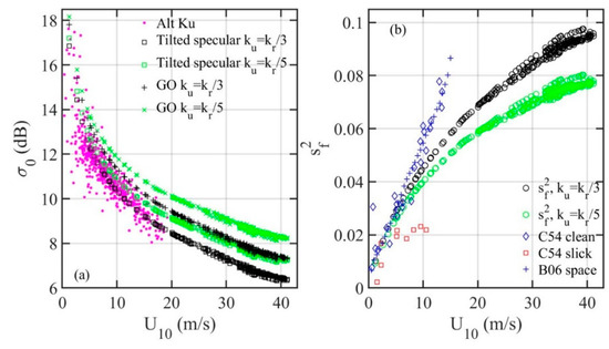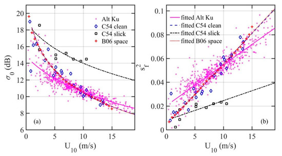 Figure 2a shows the Ku band altimeter NRCS with collocated buoy winds in the Gulf of Alaska and Bering Sea [14], and the calculated NRCSs based on the optical MSS from sun glitter analyses in clean and slick waters with wind speed measured onboard a research vessel in the region [11] or collocated spaceborne scatterometer wind product [12]. Figure 2b shows the optical MSS and derived from the Ku band altimeter NRCS using Equation (9). Two sets of MSS reported in Cox and Munk (C54) are also from sun glitter analysis but from a spaceborne optical sensor (wind speed up to 15 m/s); the results are essentially identical to those of the clean water condition in Cox and Munk [11]. For the slick waters, surface waves shorter than about 30 cm, corresponding to ku = 21 rad/m, are suppressed [11]; therefore, the two sets of optical MSS are and . The Ku band (14 GHz) EM wavelength is about 2.1 cm, with the factor kr/ku = 3 to 6 applied, the observed LPMSS is between and . The surface roughness sensed by the Ku band altimeter is expected to be between the optical data in clean and slick waters. This, however, is not the case for the result in low and moderate winds (U10 ≤ ~10 m/s), as illustrated in Figure 2b. Especially intriguing is that the discrepancy increases toward lower wind condition for which the ocean surface is less nonlinear and simplifications made in the EM theoretical development are better justified.