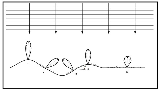A conceptual sketch depicting the scattering of radar waves by surface patches of various roughness (1, 4, and 5) and the effect of tilting background surface on the backscattering intensity from patches of identical statistical roughness (2, 3, and 4); reproducing (Figure 7, [13]).